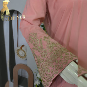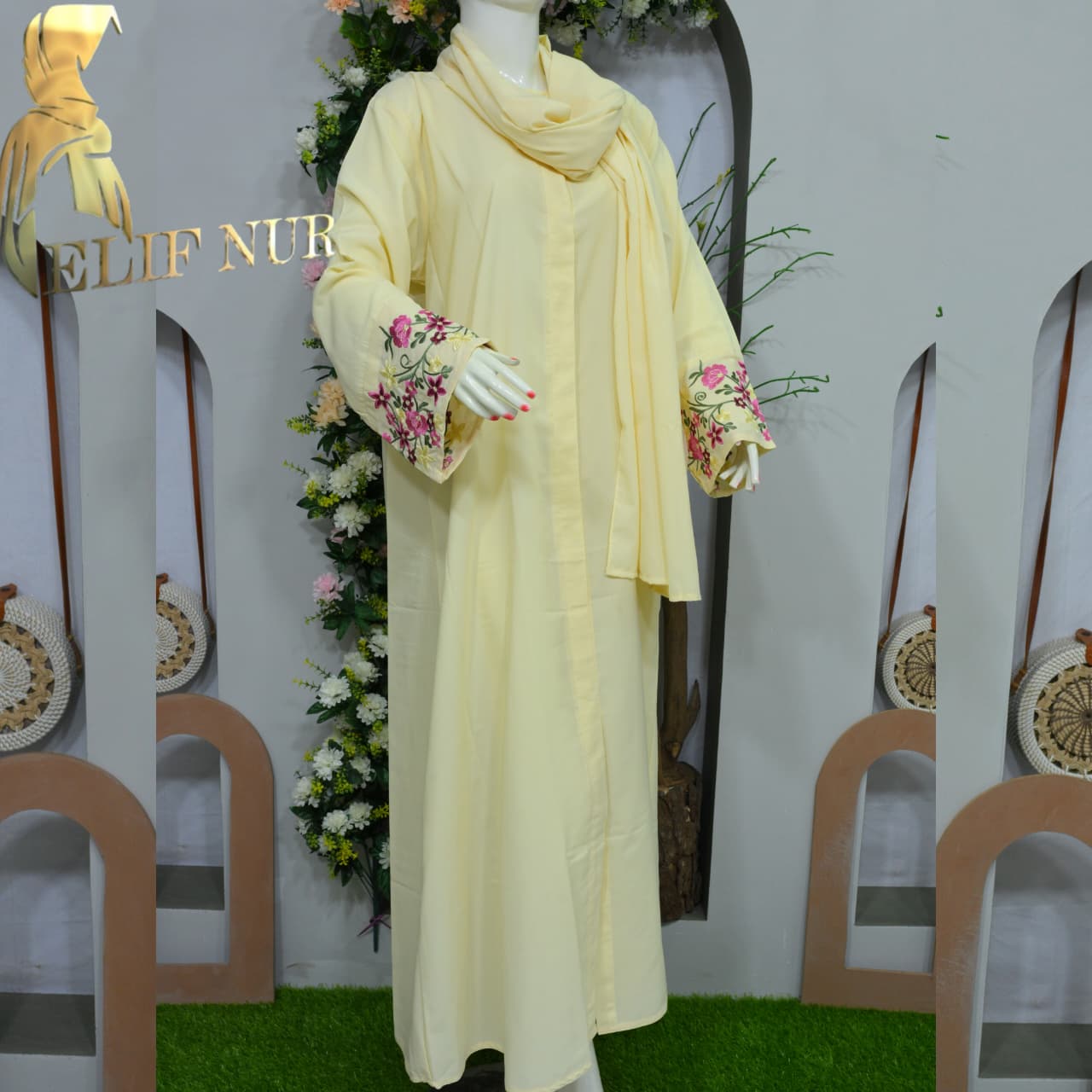 Grace meets simplicity in the Lina Abaya, crafted from premium Wool Peach fabric for a soft, breathable, and flowy finish. This abaya features a delicate light yellow hue that radiates warmth and serenity, perfect for both everyday elegance and special occasions. The standout feature is its beautifully embroidered sleeves with floral motifs, adding a touch of charm and femininity.