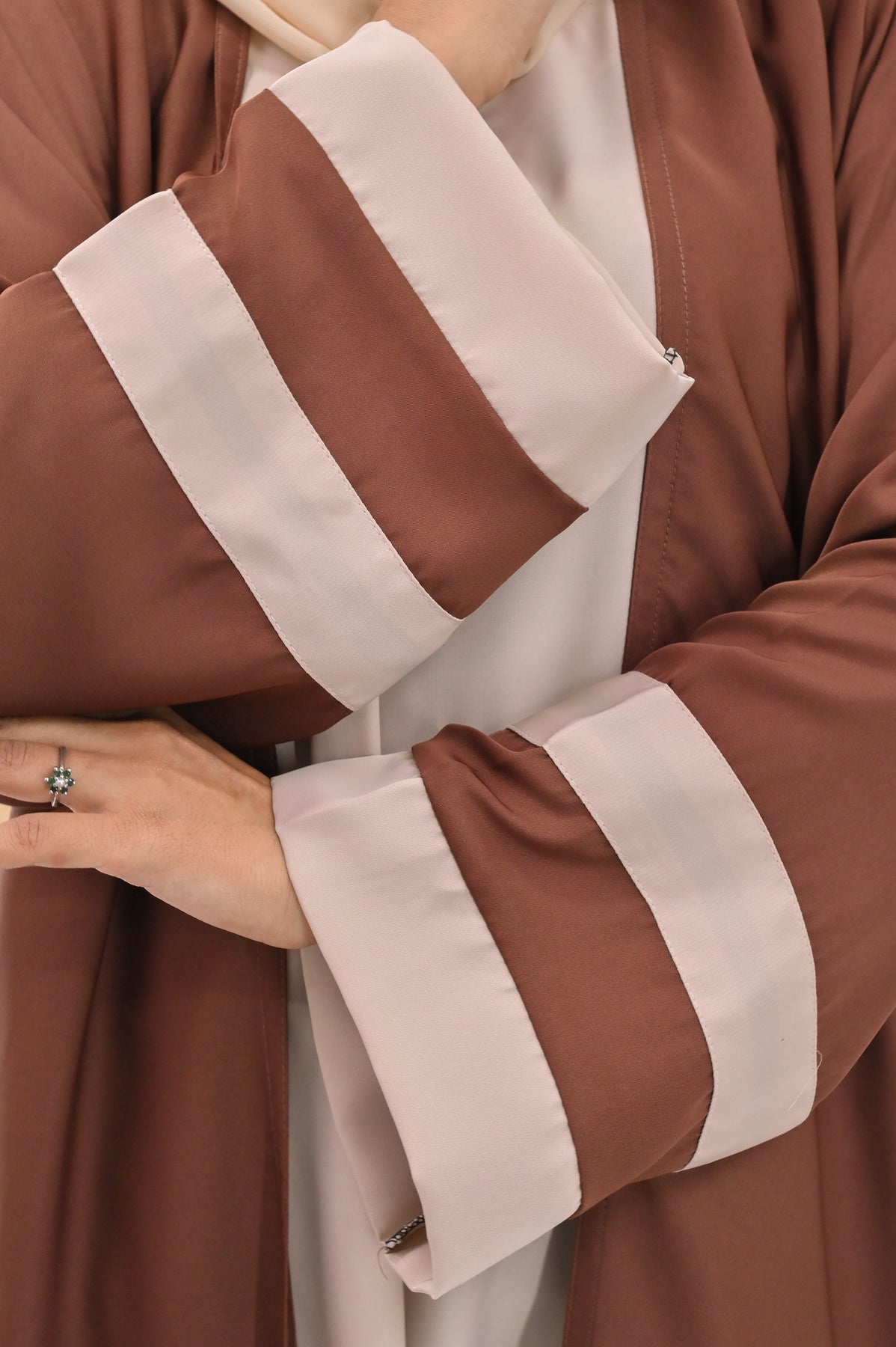 The Naima Abaya is a timeless piece crafted for women who appreciate grace, sophistication, and modest fashion. Designed with a blend of classic charm and modern elegance, this abaya features wide, flared sleeves adorned with soft, contrasting bands in earthy brown and delicate beige tones. The unique double-panel sleeve design adds a refined touch, making it perfect for both everyday wear and special occasions.