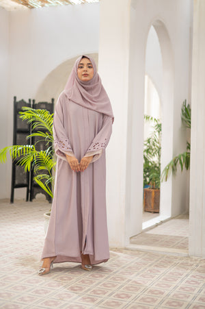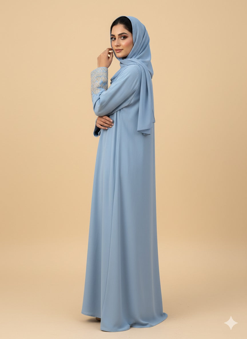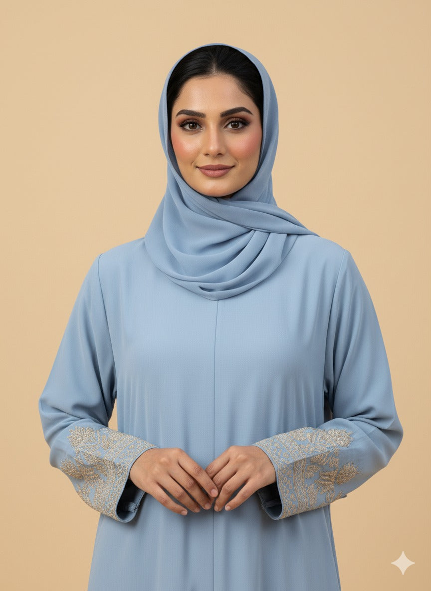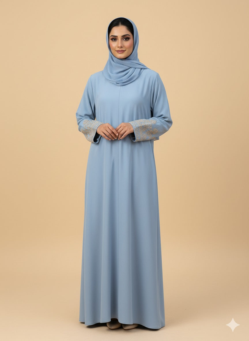 Grace and elegance come together in the Wahida Golden Sleeves Abaya, designed in a soft Sky Blue shade. Crafted from premium nida fabric, this abaya flows beautifully while offering maximum comfort. The highlight of this piece is its stunning golden embroidery on the sleeves, adding a luxurious and refined touch. Paired with a matching hijab, this abaya is ideal for both everyday wear and special gatherings.