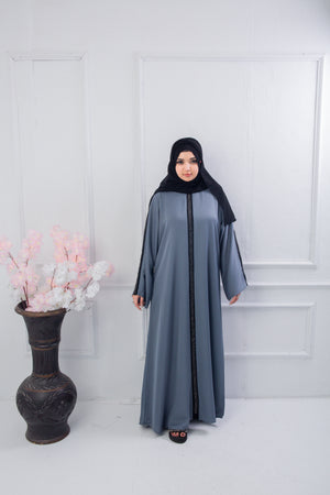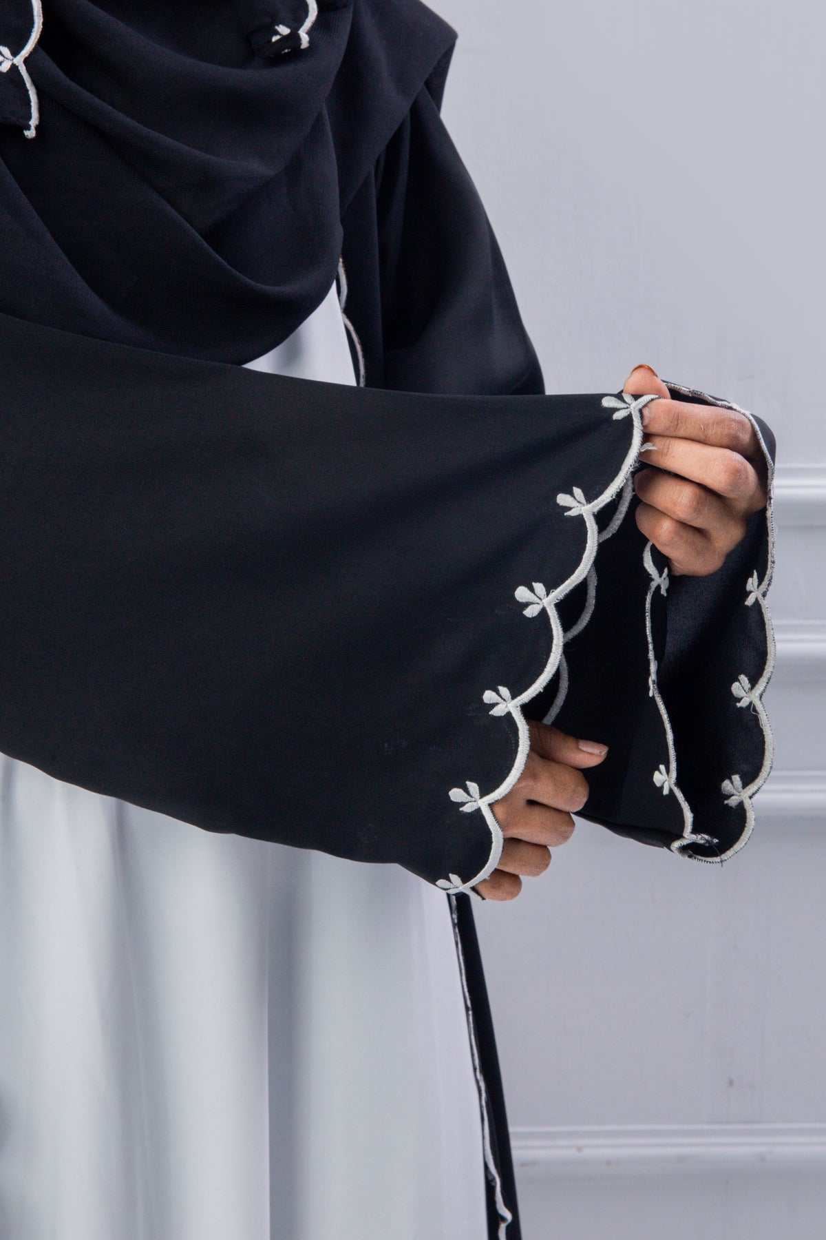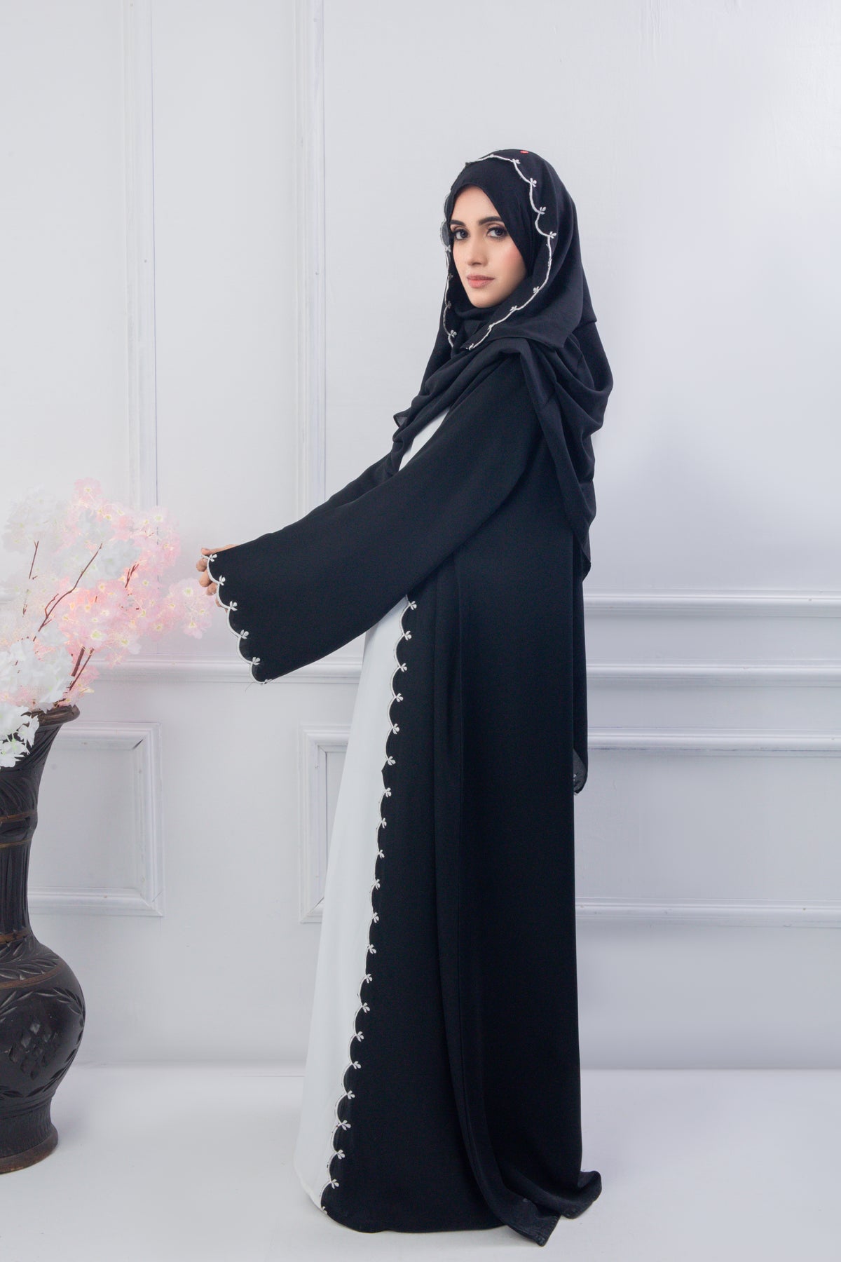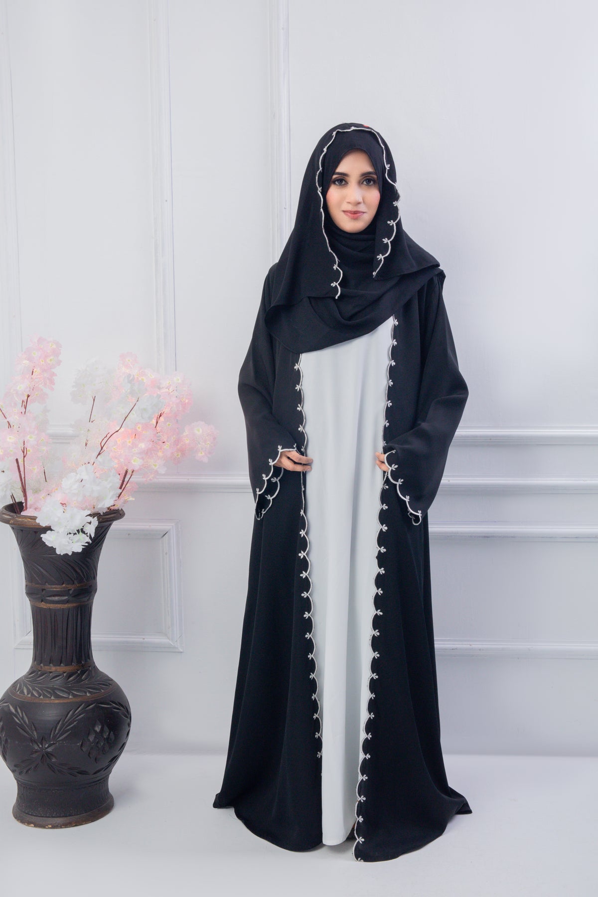 Elevate your modest fashion with this stunning black and white embroidered abaya. Designed with intricate white floral lace detailing along the sleeves and borders, this abaya exudes timeless elegance. The flowing silhouette, crafted from premium fabric, ensures a graceful drape, making it ideal for formal occasions or everyday sophistication. The contrast of black and white adds a refined charm, while the lightweight material offers comfort and breathability. Perfect for women who appreciate a blend of tradition and modern style, this abaya is a must-have in your wardrobe. Pair it with a matching hijab for a flawless, modest look.