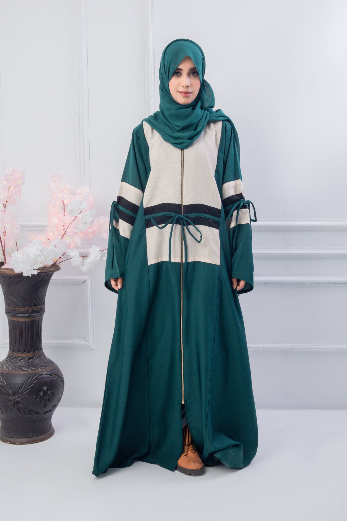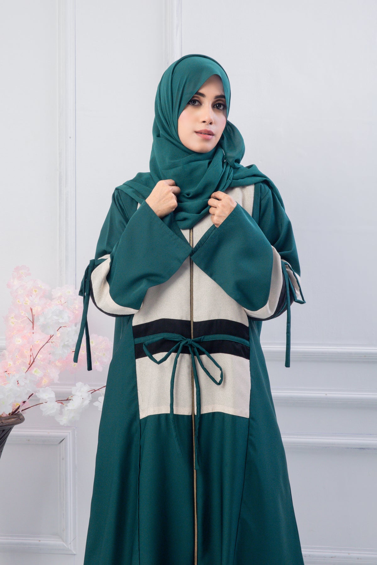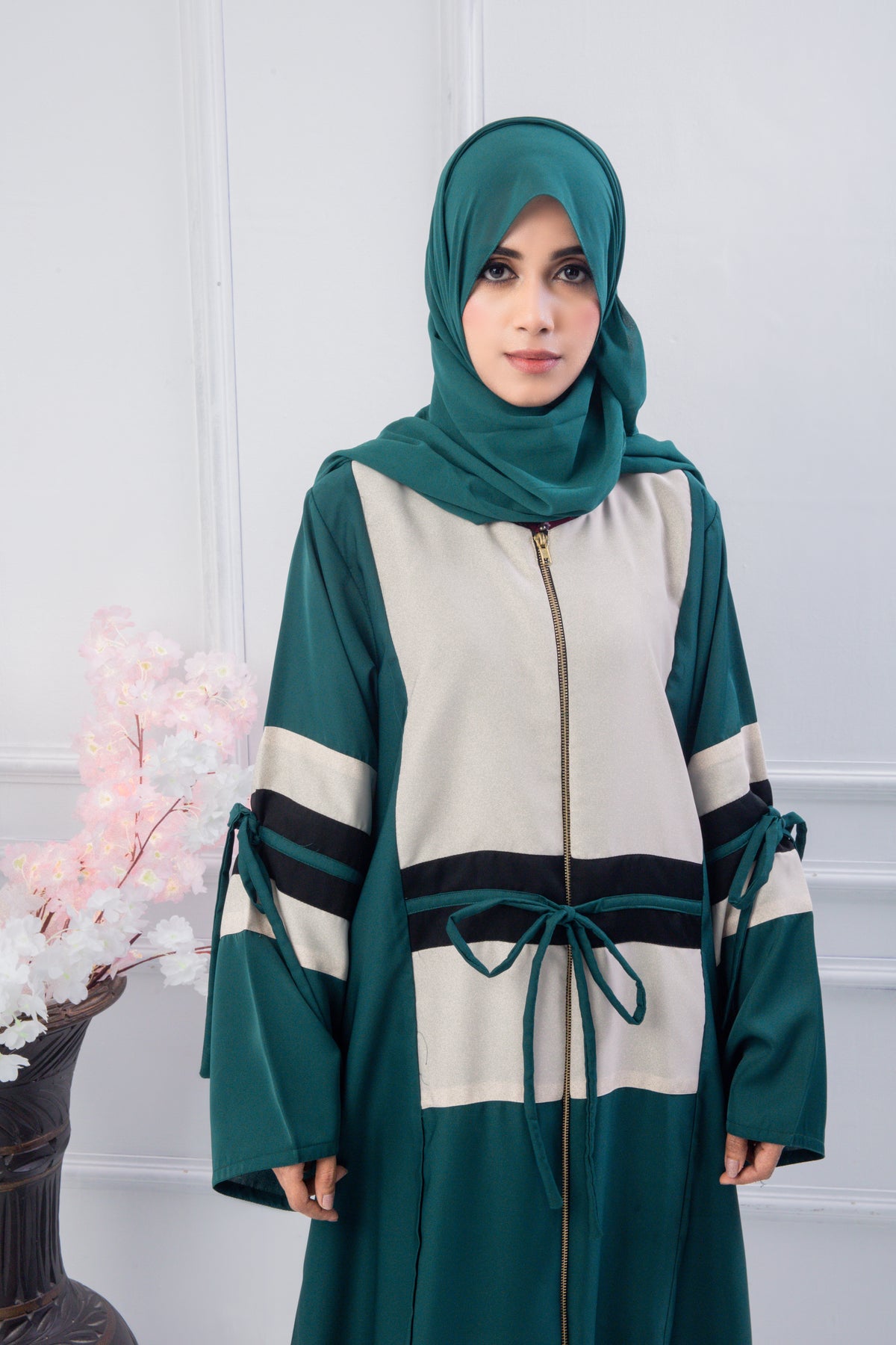 Elevate your wardrobe with this stunning front-open abaya, designed with a modern color-block pattern in deep green, beige, and black. Featuring a sleek zippered front for effortless wear and adjustable tie-up sleeves for a stylish touch, this abaya is a perfect blend of elegance and practicality. The waist tie enhances the silhouette, adding a flattering fit for all body types. Crafted from premium fabric, this abaya ensures all-day comfort while keeping you effortlessly chic. The included matching hijab completes the sophisticated look. Perfect for casual outings or special occasions, redefine modest fashion with this statement piece.