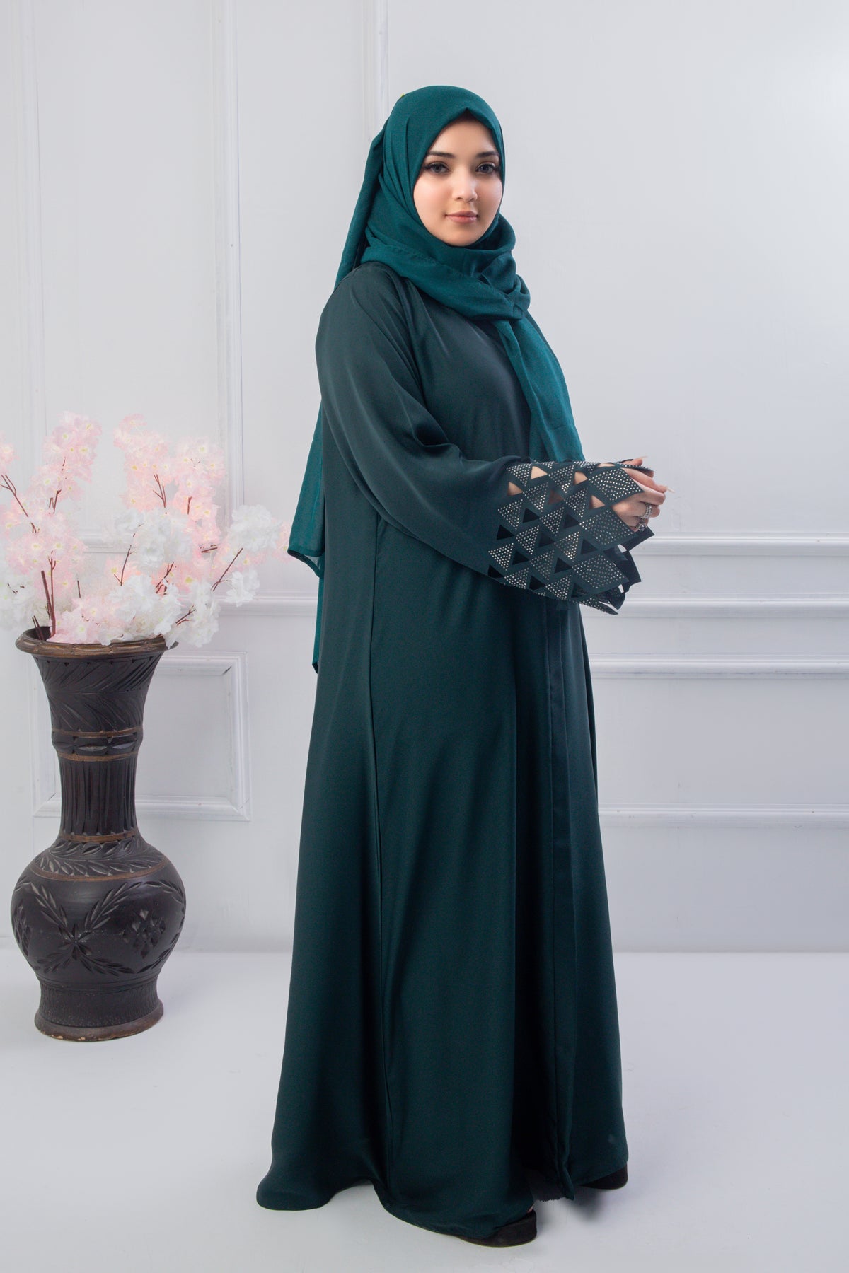 Make a bold statement with our exquisitely designed Front-Open Abaya, featuring intricate cutwork sleeves adorned with dazzling stone embellishments. The geometric cutouts add a modern flair, while the shimmering stones enhance the elegance, making it perfect for special occasions or evening wear. Crafted in a rich, deep hue, this abaya ensures both sophistication and comfort. Paired with a matching hijab, it offers a complete and graceful look. Step into luxury and refinement with this stunning piece that blends tradition with contemporary style.