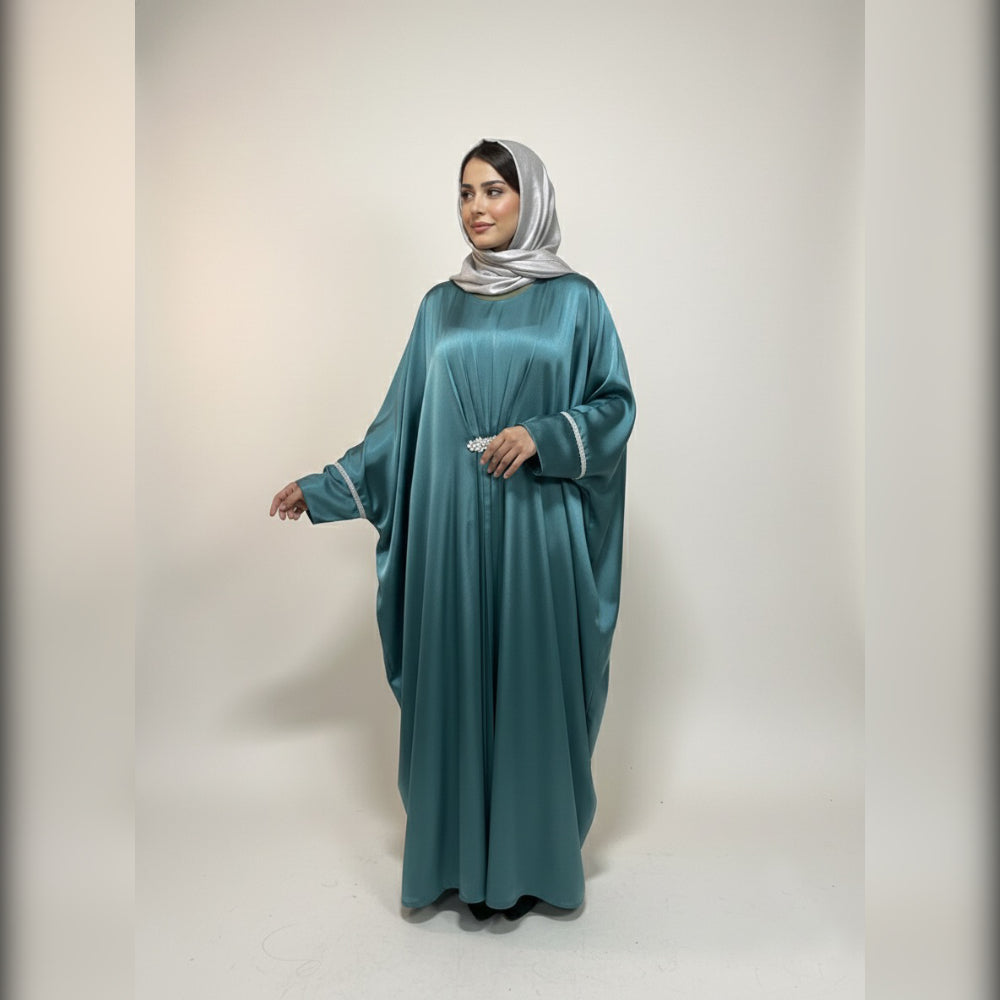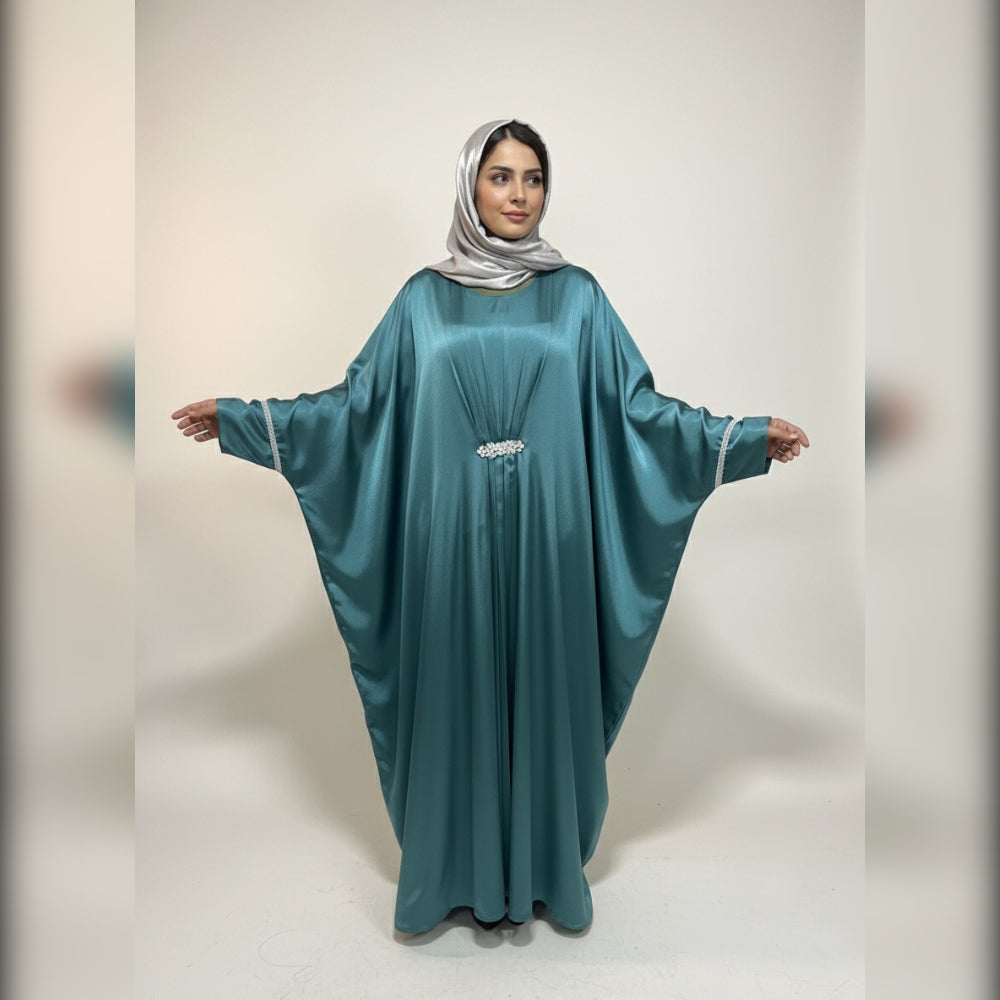 Our Emerald Grace Silk Kaftan features a luxurious satin-shimmer fabric in a rich teal tone, offering a soft glow and an elegant, fluid drape. Designed in a loose kaftan silhouette with a gathered front and a delicate crystal embellishment, this piece blends sophistication with effortless comfort—perfect for special occasions or evening wear.
